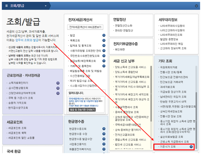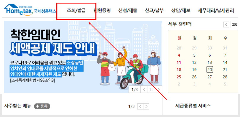 오피스텔 공시가격을 조회하려면 국세청 홈택스에 접속해야 합니다. 국세청 홈택스 사이트에 들어가면 좌측 상단에 조회/발급이라는 메뉴가 보이는데요. 먼저 이 메뉴를 클릭합니다.